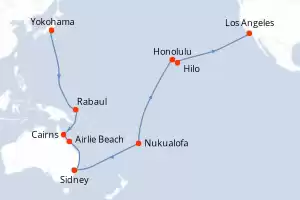 Itinerario : Yokohama, Rabaul, Cairns, Airlie Beach, Sidney, Nukualofa, date, Honolulu, Hilo, Los Angeles