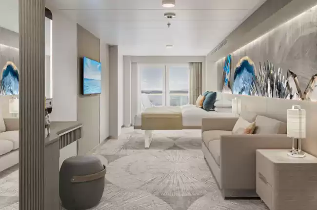 Las suites del Norwegian Prima presentan superficies que oscilan entre 23 y 58 m², complementadas con balcones privados que van de 4 a 34 m². Algunas están diseñadas para acoger hasta cuatro personas, con configuraciones que incluyen dormitorios separados y sofás cama. Ofreciéndote espacios de vida generosos con equipamientos de alta gama, cuentan con salones amplios y modernos baños.