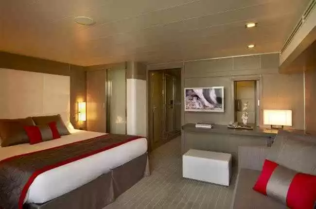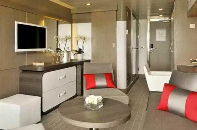 En ellas, los pasajeros encontrarán aire acondicionado individual, televisión por satélite, minibar, altavoz Bose, escritorio con artículos de papelería, tocador, caja fuerte, teléfono por satélite, enchufes de 220 V y Wi-Fi ilimitado. El cuarto de baño privado ofrece una completa selección de productos Hermès y un secador de pelo.