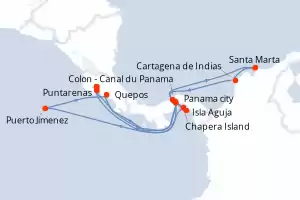 Itinerario : Colon - Canal du Panama, Santa Marta, Cartagena de Indias, Isla Aguja, Canal de Panama, Puerto Jimenez, Quepos, Flamenco Marina (Panama City), Puntarenas, Isla de Tortuga, Puntarenas, Chapera Island, Panama city