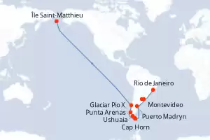 Itinerario : Rio de Janeiro, Montevideo, Buenos Aires, Puerto Madryn, Cap Horn, Ushuaia, Punta Arenas, Glaciar Pio X, Puerto Montt, Île Saint-Matthieu