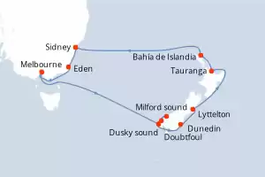 Itinerario : Auckland, Tauranga, Lyttelton, Dunedin, Dusky sound, Melbourne, Burnie, Eden, Sidney