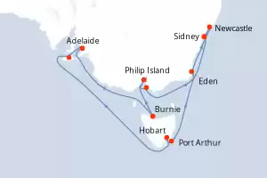 Itinerario : Sidney, Philip Island, Melbourne, Burnie, Adelaide, Isla del Canguro, Hobart, Port Arthur, Eden, Newcastle, Sidney