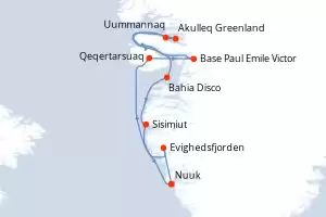 Itinerario : Reykjavik, Tasiilaq, Sermilikfjord, Fjord Skjoldungen, Pasaje de Christian Sund, Hvar, Igaliku, Ikka Fjord Groenland, Nuuk, Sisimiut, Base Paul Emile Victor, Bahia Disco, Nooralak, Kangerlussuaq