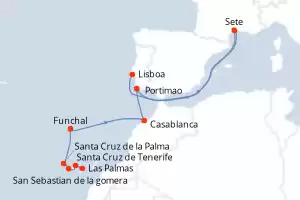 Itinerario : Las Palmas, Santa Cruz de Tenerife, San Sebastian de la gomera, Santa Cruz de la Palma, Funchal, Casablanca, Portimao, Sete, Lisboa