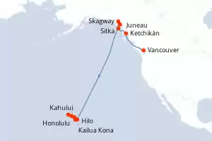 Itinerario : Vancouver, Ketchikán, Juneau, Skagway, Sitka, Hilo, Kailua Kona, Kahului, Nawiliwili, Honolulu