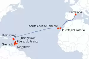 Itinerario : Barcelona, Puerto del Rosario, Santa Cruz de Tenerife, Philipsburg, Basseterre (St Kitts), Kingstown, Bridgetown, Grenada, Fort-de-France