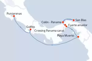 Itinerario : Colón - Panama, San Blas, Crossing Panama canal, Fuerte amador, Playa Muerto, Golfito, Puntarenas