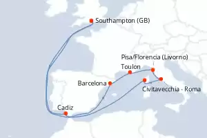 Itinerario : Southampton, Cadiz, Barcelona, Toulon, Pisa/Florencia (Livorno), Civitavecchia - Roma, Ajaccio, Southampton