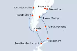 Itinerario : Buenos Aires, Montevideo, Puerto Madryn, Puerto Argentino, île Elephant, Paradise Island antartic, Ushuaia, Puerto Montt, San antonio Chile