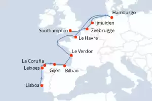 Itinerario : Southampton, Ijmuiden, Zeebrugge, Le Havre, La Rochelle, Le Verdon, Bilbao, La Coruña, Vigo, Lisboa