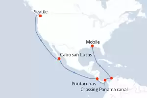 Estados Unidos, Colombia, Panamá, Costa Rica, México Itinerario: Seattle , Cabo san Lucas , Puntarenas , Crossing Panama canal , Cartagena de Indias , Mobile Comidas incluidas Spirit 17 días Camarote estándar Seattle 08/10/2026 desde US$1331 EL PRECIO NO INCLUYE LA PERCEPCIÓN DEL 30% DE AFIP - RG 5463 TARIFA NO REEMBOLSABLE Comidas incluidas Ver las ofertas