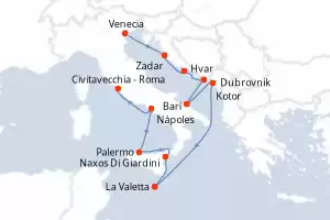 Italia, Malta, Montenegro, Croacia Itinerario: Venecia , Zadar , Hvar , Dubrovnik , Bari , Kotor , La Valetta , Naxos Di Giardini , Palermo , Nápoles , Civitavecchia - Roma , Venecia , Venecia , Zadar , Zadar , Hvar , Hvar , Dubrovnik , Dubrovnik , Bari , Bari , Kotor , Kotor , La Valetta , La Valetta , Naxos Di Giardini , Naxos Di Giardini , Palermo , Palermo , Nápoles , Nápoles , Civitavecchia - Roma , Civitavecchia - Roma Comidas incluidas Silver Muse 12 días Suite Venecia 06/05/2026 desde US$9400 EL PRECIO NO INCLUYE LA PERCEPCIÓN DEL 30% DE AFIP - RG 5463 TARIFA NO REEMBOLSABLE Comidas incluidas Ver las ofertas
