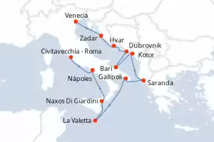 Italia, Malta, Montenegro Itinerario: Venecia , Trieste , Kotor , Bari , La Valetta , Naxos Di Giardini , Palermo , Nápoles , Civitavecchia - Roma , Venecia , Venecia , Trieste , Trieste , Kotor , Kotor , Bari , Bari , La Valetta , La Valetta , Naxos Di Giardini , Naxos Di Giardini , Palermo , Palermo , Nápoles , Nápoles , Civitavecchia - Roma , Civitavecchia - Roma Comidas incluidas Silver Nova 11 días Suite Venecia 13/11/2026 desde US$7300 EL PRECIO NO INCLUYE LA PERCEPCIÓN DEL 30% DE AFIP - RG 5463 TARIFA NO REEMBOLSABLE Comidas incluidas Ver las ofertas