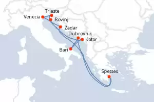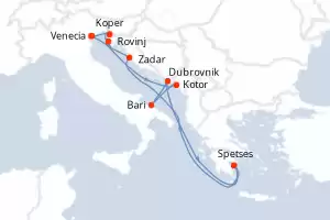Italia,Eslovenia,Croacia,Grecia,Montenegro Itinerario: Venecia , Venecia , Koper , Koper , Zadar , Zadar , Spetses , Spetses , Dubrovnik , Dubrovnik , Bari , Bari , Kotor , Kotor , Katakolon , Katakolon , Githion , Githion , El Pireo Atenas , El Pireo Atenas Comidas incluidas Silver Nova 11 días Suite Venecia 05/05/2027 desde US$8900 EL PRECIO NO INCLUYE LA PERCEPCIÓN DEL 30% DE AFIP - RG 5463 TARIFA NO REEMBOLSABLE Comidas incluidas Ver las ofertas