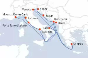 Italia,Eslovenia,Croacia,Grecia,Montenegro,Monaco Itinerario: Venecia , Venecia , Koper , Koper , Zadar , Zadar , Dubrovnik , Dubrovnik , Spetses , Spetses , Kotor , Kotor , Bari , Bari , Nápoles , Nápoles , Nápoles , Nápoles , Porto Santo Stefano , Porto Santo Stefano , Livorno , Livorno , Monaco Monte-Carlo , Monaco Monte-Carlo Comidas incluidas Silver Dawn 13 días Suite Venecia 03/11/2027 desde US$7400 EL PRECIO NO INCLUYE LA PERCEPCIÓN DEL 30% DE AFIP - RG 5463 TARIFA NO REEMBOLSABLE Comidas incluidas Ver las ofertas