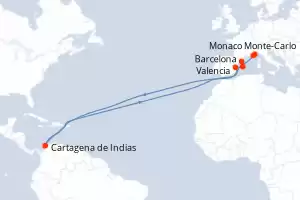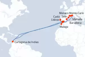 Monaco,Francia,España,Colombia,Marruecos,Portugal Itinerario: Monaco Monte-Carlo , Marsella , Sete , Barcelona , Barcelona , Valencia , Cartagena de Indias , Malaga , Tánger , Casablanca , Cadiz , Lisboa Comidas incluidas Silver Dawn 13 días Suite Monaco Monte-Carlo 15/11/2027 desde US$7200 EL PRECIO NO INCLUYE LA PERCEPCIÓN DEL 30% DE AFIP - RG 5463 TARIFA NO REEMBOLSABLE Comidas incluidas Ver las ofertas