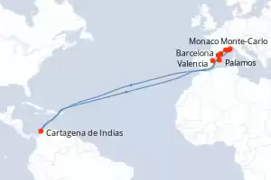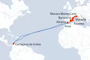 España, Francia, Monaco, Colombia Itinerario: Monaco Monte-Carlo , Marsella , Palamos , Palma de Mallorca , Ibiza , Valencia , Alicante , Cartagena de Indias , Malaga , Malaga , Barcelona Comidas incluidas Silver Ray 12 días Suite Monaco Monte-Carlo 17/09/2026 desde US$9300 EL PRECIO NO INCLUYE LA PERCEPCIÓN DEL 30% DE AFIP - RG 5463 TARIFA NO REEMBOLSABLE Comidas incluidas Ver las ofertas