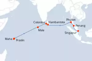Malasia, Singapur, Seychelles, India, Sri Lanka, Tailandia Itinerario: Singapur , Singapur , Port Kelang , Phuket , Trincomalee , , Colombo , Cochin , Cochin , Mahe Comidas incluidas Silver Dawn 19 días Suite Singapur 30/03/2026 desde US$6950 EL PRECIO NO INCLUYE LA PERCEPCIÓN DEL 30% DE AFIP - RG 5463 TARIFA NO REEMBOLSABLE Comidas incluidas Ver las ofertas