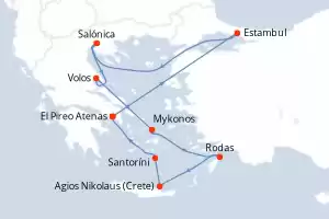Grecia, Turquía Itinerario: El Pireo Atenas , El Pireo Atenas , El Pireo Atenas , Estambul , Estambul , Estambul , Estambul , Estambul , Estambul , Salónica , Salónica , Salónica , Volos , Volos , Volos , Mykonos , Mykonos , Mykonos , Rodas , Rodas , Rodas , Agios Nikolaus (Crete) , Agios Nikolaus (Crete) , Agios Nikolaus (Crete) , Santoríni , Santoríni , Santoríni , El Pireo Atenas , El Pireo Atenas , El Pireo Atenas Comidas incluidas Silver Muse 12 días Suite El Pireo Atenas 11/04/2026 desde US$9750 EL PRECIO NO INCLUYE LA PERCEPCIÓN DEL 30% DE AFIP - RG 5463 TARIFA NO REEMBOLSABLE Comidas incluidas Ver las ofertas