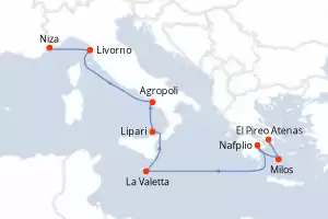 Italia, Malta, Grecia, Francia Itinerario: El Pireo Atenas , El Pireo Atenas , El Pireo Atenas , Milos , Milos , Milos , Nafplio , Nafplio , Nafplio , La Valetta , La Valetta , La Valetta , Lipari , Lipari , Lipari , Agropoli , Agropoli , Agropoli , Livorno , Livorno , Livorno , Livorno , Livorno , Livorno , Niza , Niza , Niza Comidas incluidas Silver shadow 11 días Suite El Pireo Atenas 06/05/2028 desde US$8000 EL PRECIO NO INCLUYE LA PERCEPCIÓN DEL 30% DE AFIP - RG 5463 TARIFA NO REEMBOLSABLE Comidas incluidas Ver las ofertas