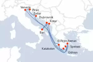 Italia, Croacia, Grecia, Montenegro Itinerario: El Pireo Atenas , Githion , Katakolon , Kotor , Spetses , Zadar , Venecia , El Pireo Atenas , El Pireo Atenas , Githion , Githion , Katakolon , Katakolon , Kotor , Kotor , Spetses , Spetses , Zadar , Zadar , Venecia , Venecia Comidas incluidas Silver Nova 8 días Suite El Pireo Atenas 26/07/2026 desde US$7300 EL PRECIO NO INCLUYE LA PERCEPCIÓN DEL 30% DE AFIP - RG 5463 TARIFA NO REEMBOLSABLE Comidas incluidas Ver las ofertas