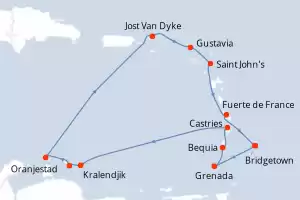 Barbados,Grenada,San Vincent y las Granadinas,Santa Lucia,Paises Bajos,Aruba,Reino Unido,Antigua y Barbuda,Francia Itinerario: Bridgetown , Grenada , Bequia , Castries , Kralendjik , Willemstad(Curaçao) , Oranjestad (Aruba) , Jost Van Dyke , Gustavia , Saint John's , Fort-de-France , Bridgetown Comidas incluidas Silver Spirit 14 días Suite Bridgetown 28/12/2027 desde US$5900 EL PRECIO NO INCLUYE LA PERCEPCIÓN DEL 30% DE AFIP - RG 5463 TARIFA NO REEMBOLSABLE Comidas incluidas Ver las ofertas