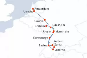 Paises Bajos,Alemania,Francia,Suiza Itinerario: Amsterdam , Amsterdam , Utrecht , Colonia , Cochem , Koblenz , Rudesheim , Speyer , Mannheim , Estrasburgo , Basilea , Lucerne , Lucerne , Zurich , Lucerne , Zurich Comidas incluidas Amadeus Star 11 días Camarote exterior Amsterdam 09/09/2026 desde US$4262 EL PRECIO NO INCLUYE LA PERCEPCIÓN DEL 30% DE AFIP - RG 5463 TARIFA NO REEMBOLSABLE Comidas incluidas Ver las ofertas