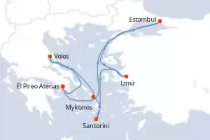 Grecia, Turquía Itinerario: El Pireo Atenas , Estambul , Izmir , Santoríni , Mykonos , Volos , El Pireo Atenas Comidas incluidas Costa Fortuna 8 días Camarote estándar El Pireo Atenas 22/05/2026 desde US$1033 EL PRECIO NO INCLUYE LA PERCEPCIÓN DEL 30% DE AFIP - RG 5463 TARIFA NO REEMBOLSABLE Comidas incluidas Otros puertos de embarque : Estambul Ver las ofertas