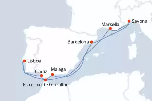 España, Gibraltar, Portugal, Francia, Italia Itinerario: Barcelona , Estrecho de Gibraltar , Lisboa , Lisboa , Cadiz , Malaga , Marsella , Savona , Barcelona Comidas incluidas Costa Fascinosa 11 días Camarote estándar Barcelona 16/11/2026 desde US$915 EL PRECIO NO INCLUYE LA PERCEPCIÓN DEL 30% DE AFIP - RG 5463 TARIFA NO REEMBOLSABLE Comidas incluidas Otros puertos de embarque : Savona Marsella Malaga Ver las ofertas