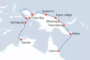 Indonesia, Papúa Nueva Guinea, Australia Itinerario: Darwin , Kei Islands , Triton Bay , Mommon Waterfall , Cenderawasih Bay , Cenderawasih Bay , Jayapura , kopar village , Madang , Tami Island , , Alotau , Cairns Comidas incluidas Le Jacques Cartier 17 días Suite Darwin 22/11/2025 desde US$36195 EL PRECIO NO INCLUYE LA PERCEPCIÓN DEL 30% DE AFIP - RG 5463 TARIFA NO REEMBOLSABLE Comidas incluidas Ver las ofertas