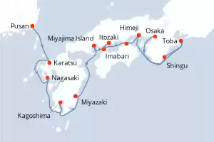 Japón Itinerario: Pusan , Karatsu , Nagasaki , Kagoshima , Miyazaki , Uwajima , Tamano , Itozaki , Miyajima Island , Hiroshima , Himeji , Shingu , Toba , Osaka Comidas incluidas Le Soleal 13 días Camarote balcón Pusan 19/05/2026 desde US$14832 EL PRECIO NO INCLUYE LA PERCEPCIÓN DEL 30% DE AFIP - RG 5463 TARIFA NO REEMBOLSABLE Comidas incluidas Ver las ofertas