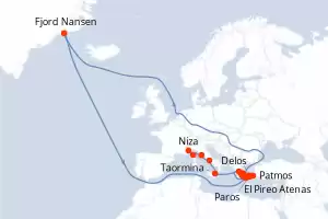 Douce escapade méditerranéenne Itinerario: El Pireo Atenas , Patmos , Delos , Paros , Adamas , Fjord Nansen , Hidra , Canal de Corinto , Galaxidi , Taormina , Gaeta , Porto Santo Stefano , Calvi , Niza Comidas incluidas Le Boreal 13 días Camarote balcón El Pireo Atenas 17/07/2026 desde US$9496 EL PRECIO NO INCLUYE LA PERCEPCIÓN DEL 30% DE AFIP - RG 5463 TARIFA NO REEMBOLSABLE Comidas incluidas Ver las ofertas