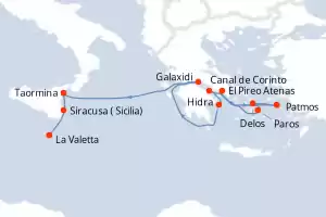 Îles paisibles et trésors antiques de Méditerranée Itinerario: La Valetta , Taormina , , Parga , Paxos , Canal de Corinto , Galaxidi , Adamas , Hidra , El Pireo Atenas Comidas incluidas Le Laperouse 9 días Camarote balcón La Valetta 17/08/2027 desde US$5937 EL PRECIO NO INCLUYE LA PERCEPCIÓN DEL 30% DE AFIP - RG 5463 TARIFA NO REEMBOLSABLE Comidas incluidas Ver las ofertas