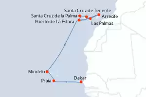 España, Cabo Verde, Senegal Itinerario: Dakar , Praia , Mindelo , Santa Cruz de la Palma , Santa Cruz de Tenerife , Puerto de La Estaca , Arrecife , Las Palmas Comidas incluidas Le Dumont d Urville 11 días Camarote balcón Dakar 15/03/2027 desde US$5550 EL PRECIO NO INCLUYE LA PERCEPCIÓN DEL 30% DE AFIP - RG 5463 TARIFA NO REEMBOLSABLE Comidas incluidas Ver las ofertas