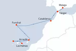 España, Portugal, Marruecos Itinerario: Malaga , Tánger , Casablanca , Funchal , Santa Cruz de la Palma , Arrecife , Las Palmas Comidas incluidas Le Champlain 9 días Camarote balcón Malaga 25/11/2026 desde US$5326 EL PRECIO NO INCLUYE LA PERCEPCIÓN DEL 30% DE AFIP - RG 5463 TARIFA NO REEMBOLSABLE Comidas incluidas Ver las ofertas