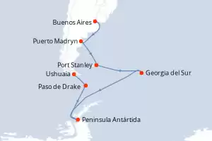 Antártico, Argentina Itinerario: Ushuaia , Paso de Drake , Paso de Drake , North Antartic Peninsula , Mar de Weddell , Mar de Weddell , Mar de Weddell , Mar de Weddell , Mar de Weddell , Mar de Weddell , Paso de Drake , Paso de Drake , Ushuaia Comidas incluidas Le Commandant Charcot 13 días Camarote balcón Ushuaia 24/11/2025 desde US$32215 EL PRECIO NO INCLUYE LA PERCEPCIÓN DEL 30% DE AFIP - RG 5463 TARIFA NO REEMBOLSABLE Comidas incluidas Ver las ofertas