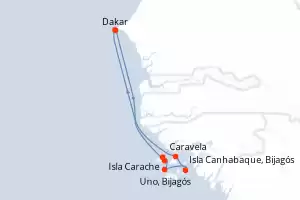Guinea, Senegal Itinerario: Dakar , Carache Island , Maio Island Bijagos , Orango Island , Uno, Bijagos , Orango Island , Joao Vieira Island, Bijagos , Cavalos, Bijagos , Bolama , Canhabaque, Bijagos , Caravela , Dakar Comidas incluidas Le Laperouse 9 días Camarote balcón Dakar 11/11/2026 desde US$5609 EL PRECIO NO INCLUYE LA PERCEPCIÓN DEL 30% DE AFIP - RG 5463 TARIFA NO REEMBOLSABLE Comidas incluidas Otras fechas : 8 ene. 26 19 nov. 26 Ver las ofertas
