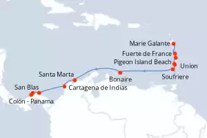 Colombia, Paises Bajos, San Vincent y las Granadinas, Santa Lucia, Francia, Panamá Itinerario: Fort-de-France , Marie Galante , Pigeon Island Beach , Soufriere , Union , Union , Mayreau , Bonaire , Santa Marta , Cartagena de Indias , San Blas , Porto bello , Colón - Panama Comidas incluidas Le Laperouse 13 días Camarote balcón Fort-de-France 07/12/2026 desde US$8101 EL PRECIO NO INCLUYE LA PERCEPCIÓN DEL 30% DE AFIP - RG 5463 TARIFA NO REEMBOLSABLE Comidas incluidas Ver las ofertas