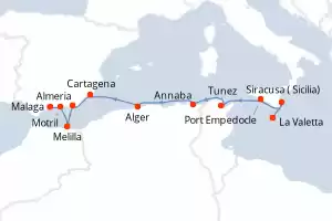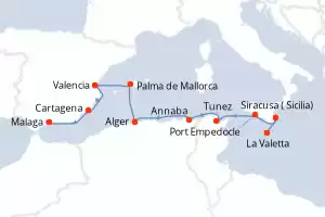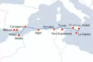 Italia, Malta, Algeria, España, Túnez Itinerario: La Valetta , Siracusa ( Sicilia) , Port Empedocle , Tunez , Annaba , Alger , Cartagena , Melilla , Motril , Malaga Comidas incluidas Le Champlain 10 días Camarote balcón La Valetta 16/11/2026 desde US$7263 EL PRECIO NO INCLUYE LA PERCEPCIÓN DEL 30% DE AFIP - RG 5463 TARIFA NO REEMBOLSABLE Comidas incluidas Ver las ofertas