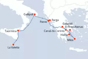 Îles paisibles et trésors antiques de Méditerranée Itinerario: La Valetta , Taormina , Gallipoli , Parga , Paxos , Galaxidi , Canal de Corinto , Milos , Hidra , El Pireo Atenas Comidas incluidas Le Laperouse 9 días Camarote balcón La Valetta 17/08/2027 desde US$5869 EL PRECIO NO INCLUYE LA PERCEPCIÓN DEL 30% DE AFIP - RG 5463 TARIFA NO REEMBOLSABLE Comidas incluidas Ver las ofertas