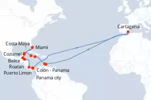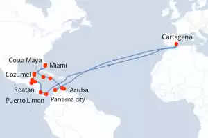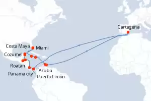 Panamá, Costa Rica, Honduras, Belice, México, Estados Unidos, Islas Caimán, Jamaica, Paises Bajos, España Itinerario: Miami , Cozumel , Costa Maya , Belice , Roatan , Puerto Limon , Colón - Panama , Panama city , Cartagena , Willemstad(Curaçao) , Aruba , Montego Bay , Gran Caiman , Miami Comidas incluidas Oceania Marina 21 días Camarote estándar Miami 06/01/2028 desde US$6695 EL PRECIO NO INCLUYE LA PERCEPCIÓN DEL 30% DE AFIP - RG 5463 TARIFA NO REEMBOLSABLE Comidas incluidas Ver las ofertas