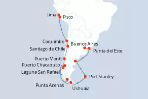 Perú, Argentina, Uruguay, Islas Malvinas, Chile Itinerario: Lima , Pisco , Coquimbo , Santiago de Chile , Puerto Montt , Puerto Chacabuco , Laguna San Rafael , Punta Arenas , Ushuaia , Puerto Argentino , Puerto Madryn , Punta del Este , Buenos Aires Comidas incluidas Oceania Insignia 22 días Camarote estándar Lima 03/01/2027 desde US$6125 EL PRECIO NO INCLUYE LA PERCEPCIÓN DEL 30% DE AFIP - RG 5463 TARIFA NO REEMBOLSABLE Comidas incluidas Ver las ofertas