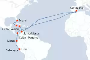 Perú, Ecuador, Panamá, España, Colombia, Jamaica, Islas Caimán, Estados Unidos Itinerario: Miami , Gran Caiman , Ocho Rios , Santa Marta , Cartagena , Colón - Panama , Manta , Salaverry , Lima , Lima Comidas incluidas Oceania Sirena 15 días Camarote estándar Miami 05/01/2028 desde US$4640 EL PRECIO NO INCLUYE LA PERCEPCIÓN DEL 30% DE AFIP - RG 5463 TARIFA NO REEMBOLSABLE Comidas incluidas Ver las ofertas