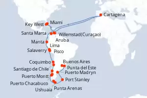 Estados Unidos,Paises Bajos,Colombia,España,Ecuador,Perú,Chile,Argentina,Islas Malvinas,Uruguay Itinerario: Miami , Key West , Willemstad(Curaçao) , Aruba , Santa Marta , Cartagena , Manta , Salaverry , Lima , Lima , Pisco , Coquimbo , Santiago de Chile , Puerto Montt , Puerto Chacabuco , Laguna San Rafael , Punta Arenas , Ushuaia , Puerto Argentino , Puerto Madryn , Punta del Este , Buenos Aires Comidas incluidas Oceania Insignia 37 días Camarote estándar Miami 19/12/2026 desde US$10792 EL PRECIO NO INCLUYE LA PERCEPCIÓN DEL 30% DE AFIP - RG 5463 TARIFA NO REEMBOLSABLE Comidas incluidas Ver las ofertas