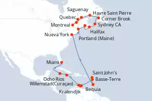 Paises Bajos, Francia, Antigua y Barbuda, San Vincent y las Granadinas, Estados Unidos, Canadá, Islas Caimán, Jamaica Itinerario: Montreal , Quebec , Saguenay , Baie-Comeau , Havre Saint Pierre , Corner Brook , Sidney , Halifax , Saint John , Portland (Maine) , Nueva York , Bequia , Saint John's , Basse-Terre (Guadalupe) , Kralendjik , Willemstad(Curaçao) , Aruba , Ocho Rios , Gran Caiman , Miami Comidas incluidas Oceania Sirena 28 días Camarote estándar Montreal 25/10/2027 desde US$9493 EL PRECIO NO INCLUYE LA PERCEPCIÓN DEL 30% DE AFIP - RG 5463 TARIFA NO REEMBOLSABLE Comidas incluidas Ver las ofertas