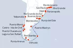 Chile, Brasil, Uruguay, Argentina, Islas Malvinas Itinerario: Valparaíso , Puerto Montt , Castro - Isla de Chili , Puerto Chacabuco , Laguna San Rafael , Punta Arenas , Punta Arenas , Ushuaia , Puerto Argentino , Puerto Madryn , Buenos Aires , Montevideo , Punta del Este , Rio Grande do Sul , Florianopolis , Itajai , Sao Paulo , Parati , Ilha Grande , Buzios , Rio de Janeiro , Rio de Janeiro Comidas incluidas Oceania Insignia 34 días Camarote estándar Valparaíso 14/02/2027 desde US$10143 EL PRECIO NO INCLUYE LA PERCEPCIÓN DEL 30% DE AFIP - RG 5463 TARIFA NO REEMBOLSABLE Comidas incluidas Ver las ofertas