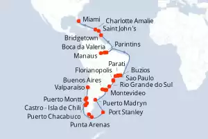Brasil, Estados Unidos, Antigua y Barbuda, Reino Unido, Uruguay, Barbados, Argentina, Islas Malvinas, Chile Itinerario: Valparaíso , Puerto Montt , Castro - Isla de Chili , Puerto Chacabuco , Laguna San Rafael , Punta Arenas , Punta Arenas , Ushuaia , Puerto Argentino , Puerto Madryn , Buenos Aires , Montevideo , Punta del Este , Rio Grande do Sul , Florianopolis , Itajai , Sao Paulo , Parati , Ilha Grande , Buzios , Rio de Janeiro , Rio de Janeiro , , Boca da Valeria , Manaus , Manaus , Parintins , Santarem , Bridgetown , Saint John's , Charlotte Amalie , Miami Comidas incluidas Oceania Insignia 55 días Camarote estándar Valparaíso 14/02/2027 desde US$16614 EL PRECIO NO INCLUYE LA PERCEPCIÓN DEL 30% DE AFIP - RG 5463 TARIFA NO REEMBOLSABLE Comidas incluidas Ver las ofertas