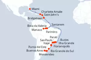 Brasil, Antigua y Barbuda, Estados Unidos, Uruguay, Barbados, Reino Unido, Argentina Itinerario: Buenos Aires , Montevideo , Punta del Este , Rio Grande do Sul , Florianopolis , Itajai , Sao Paulo , Parati , Ilha Grande , Buzios , Rio de Janeiro , Rio de Janeiro , , Boca da Valeria , Manaus , Manaus , Parintins , Santarem , Bridgetown , Saint John's , Charlotte Amalie , Miami Comidas incluidas Oceania Insignia 34 días Camarote estándar Buenos Aires 07/03/2027 desde US$9930 EL PRECIO NO INCLUYE LA PERCEPCIÓN DEL 30% DE AFIP - RG 5463 TARIFA NO REEMBOLSABLE Comidas incluidas Ver las ofertas