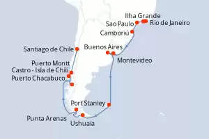 Chile, Argentina, Islas Malvinas, Uruguay, Brasil Itinerario: Rio de Janeiro , Ilha Grande , Sao Paulo , Camboriú , Montevideo , Buenos Aires , Buenos Aires , Puerto Argentino , Ushuaia , Punta Arenas , Puerto Chacabuco , Castro - Isla de Chili , Puerto Montt , Santiago de Chile Comidas incluidas Oceania Marina 25 días Suite Rio de Janeiro 22/01/2026 desde US$15539 EL PRECIO NO INCLUYE LA PERCEPCIÓN DEL 30% DE AFIP - RG 5463 TARIFA NO REEMBOLSABLE Comidas incluidas Ver las ofertas